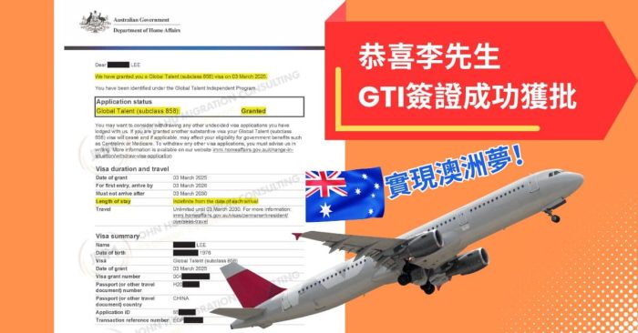胡康邦移民顧問公司 近日又收到好消息,我們的客戶李先生於2025年3月3日成功獲批澳洲GTI簽證(Global…