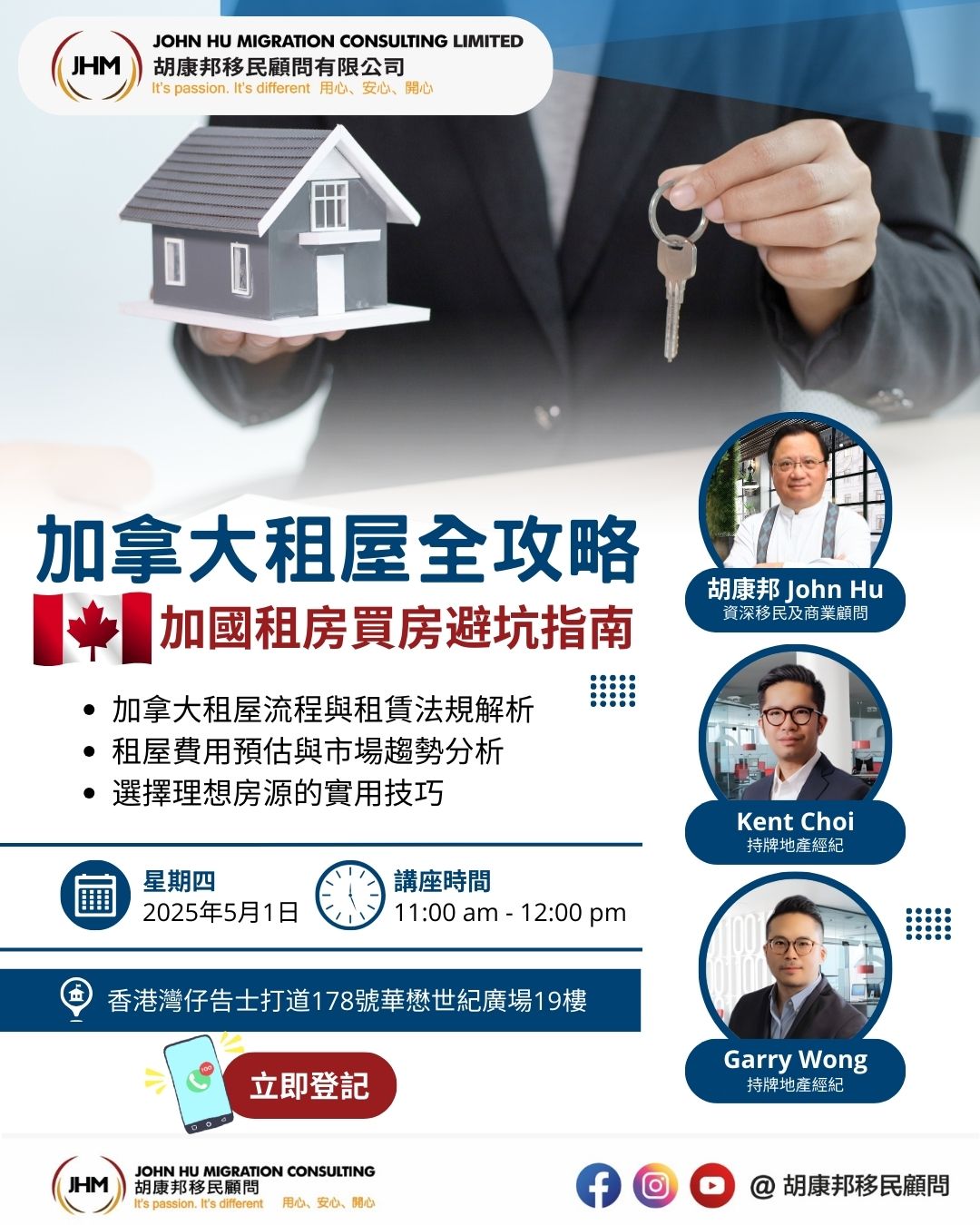 五一假期来胡康邦移民灣仔辦公室, 加拿大持牌地產經紀幫你一次解答加拿大租屋及買屋會面對的問題✅!