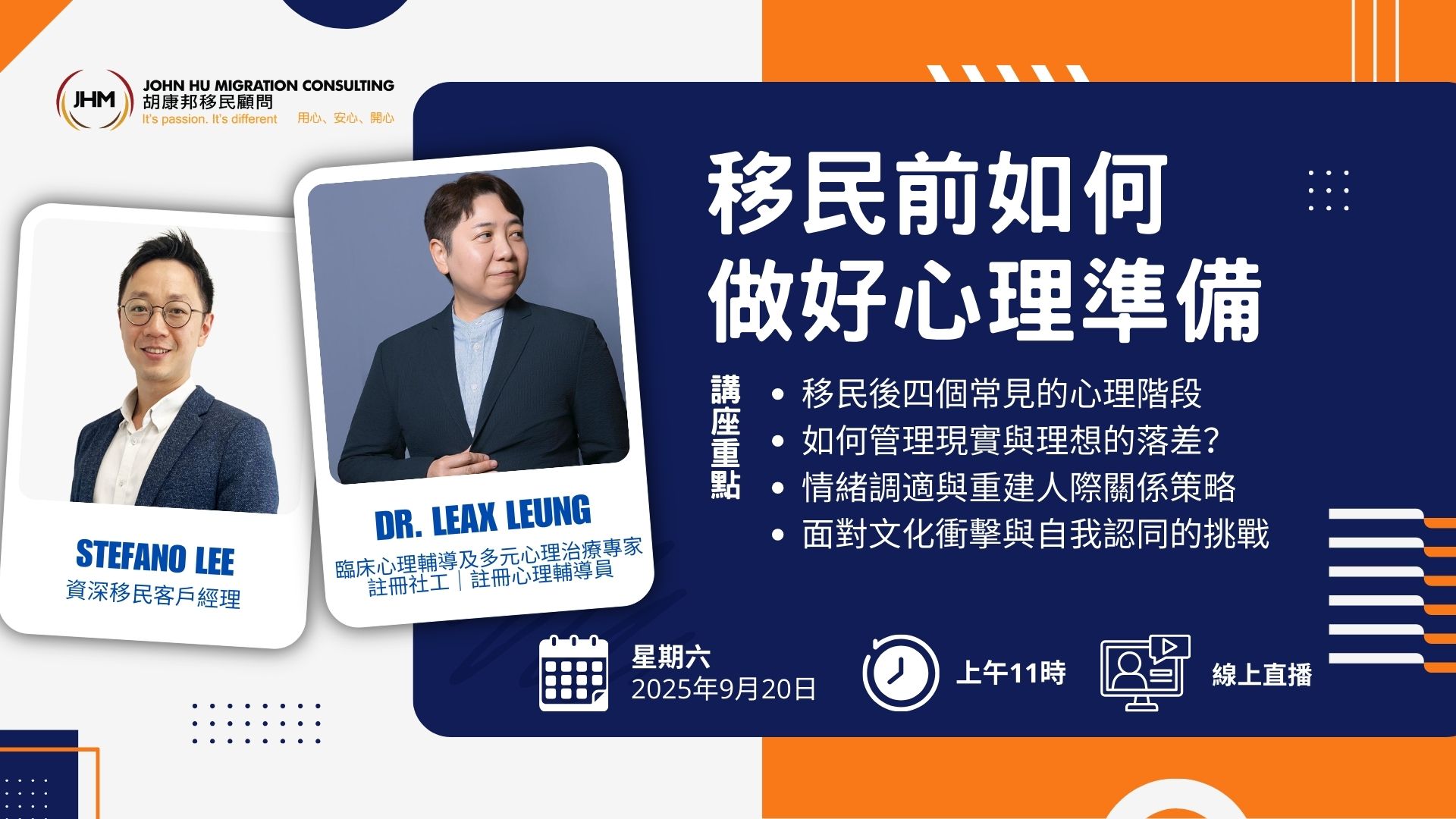 移民,不僅是地理上嘅遷移,更是一場心靈上嘅轉變!胡康邦移民誠摯邀請您,參加由資深心理輔導專家 梁思敏博士 主講嘅免費線上講座——✨《移民前,你需要做好的心理準備》✨